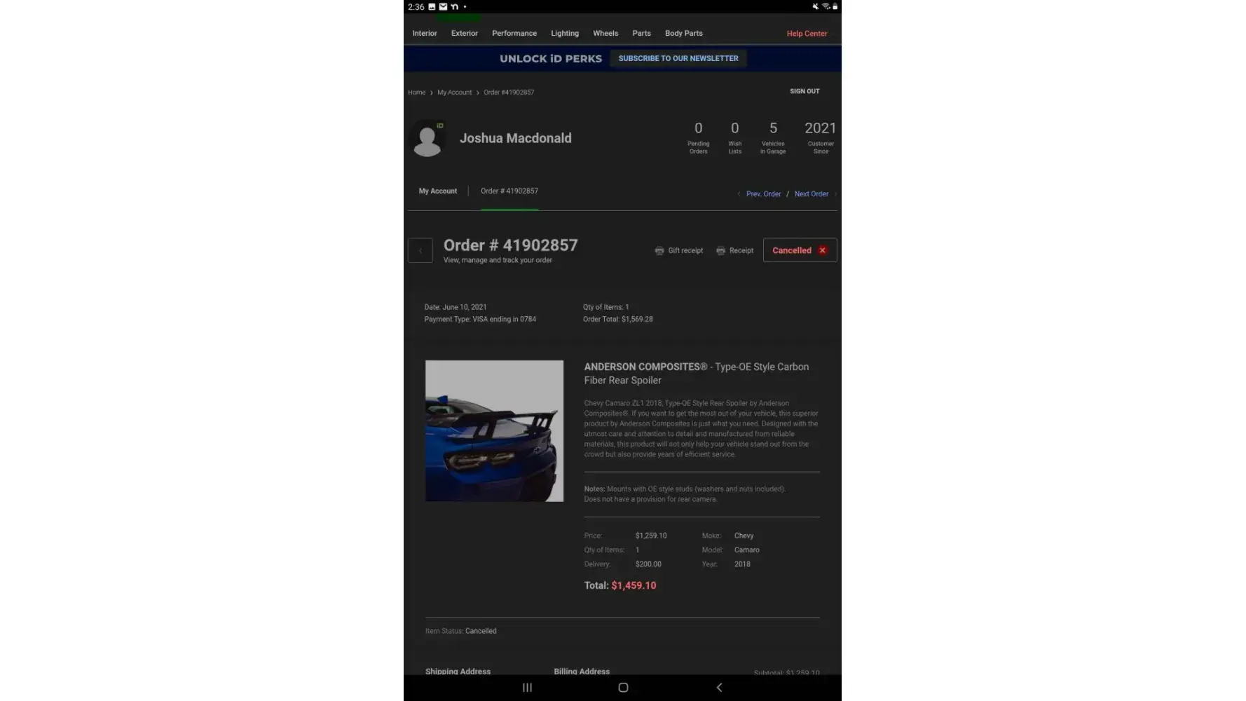 $1,600 for Anderson composites carbon fiber zl1 wing never recieved a year later no product no refund just lies from carid1111