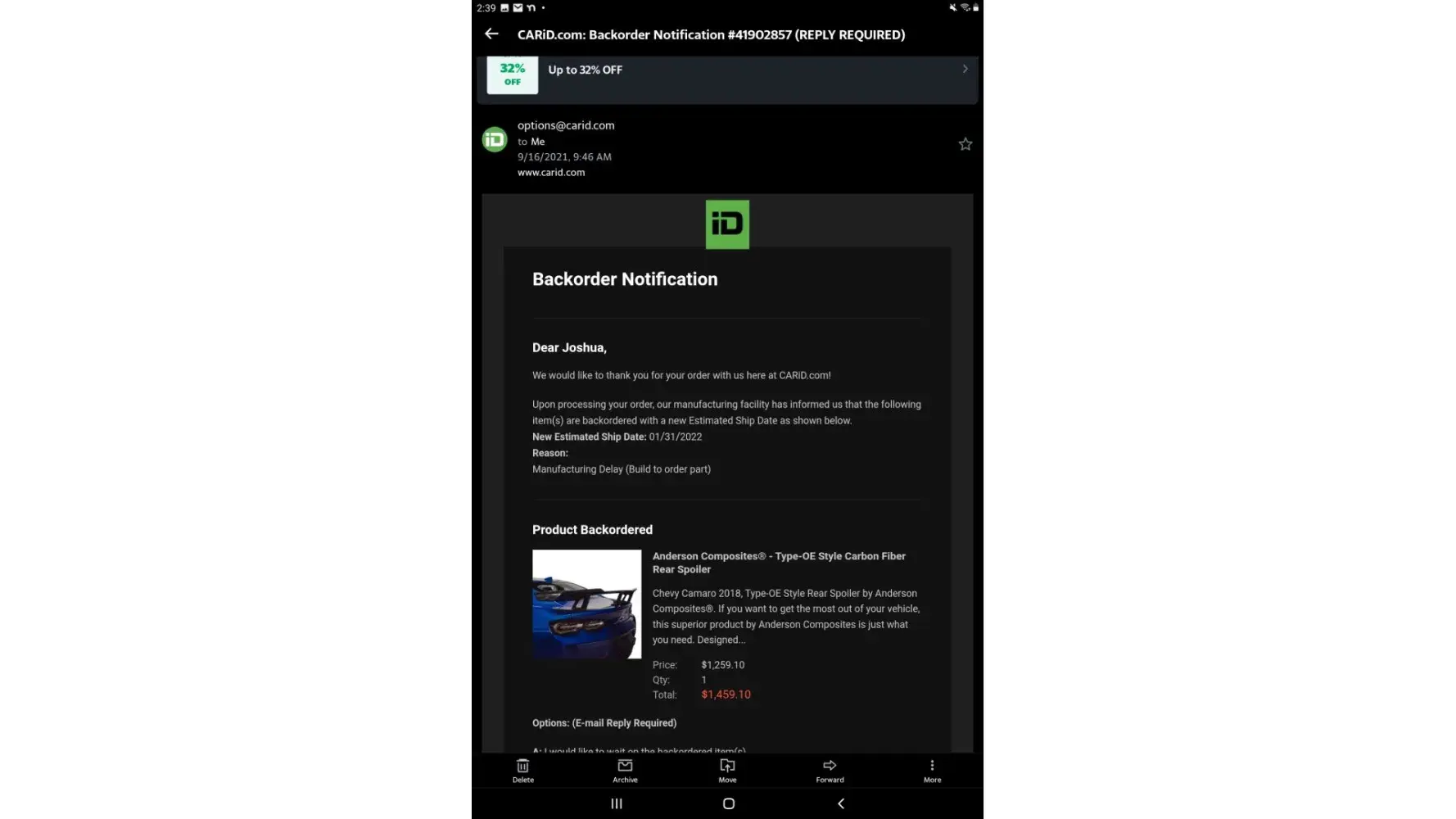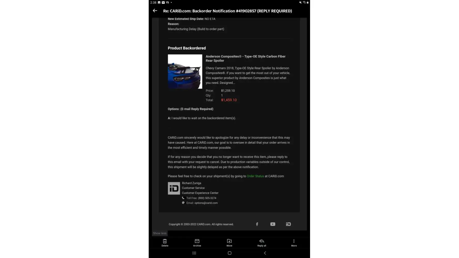 This is getting to the point of insanity and I’m very fed up with carid amd I'm getting very angry at the lack of response and professionalsism of caid. I paid you guys $1,600 June 2021 for a carbon fiber Zl1 wing by Anderson composites. You guys always waiting till the day you said I would receive it to inform me that it’s been put on back order again . After 5-6 back orders you guys then told me the expected ship date cannot be deters this time .Then I ask for a refund and it’s been 180 days so you can’t refund my card but that’s not my fault that’s yours so I don’t see why you can’t make an exception to that’s policy considering it was your fault and you have been holding my $1,600 hostage for a year now . That is not acceptable and I will file a claim against you , report you to The better business bureaua . You claim to have mailed my refund check on April 14th , was told by one of you that it would take 3-5 business days ,another told me 7-10, I even called and they told me last Friday at the latest .Everytime I reach out you guys tell me 24-48 hours you’ll contact me but never do . I’m very fed up and I will get legal if I don’t get my money back in a day or two . No excuse for this