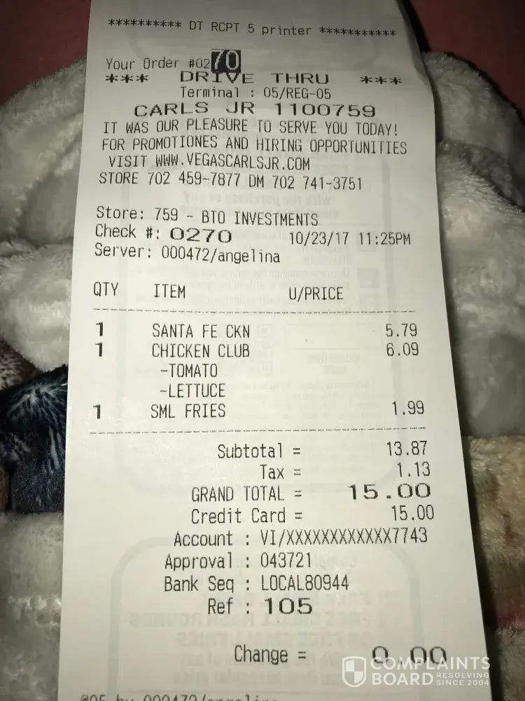 The food we ordered was absolutely horrible, the bread was hard and the sandwich I order was 6 dollars and she gave me a 99 cent one the sandwich was super greasy, she kept making me move back so she can reset the timer, I have never ever been so disgusted with carl’s jr. Before! I took pictures of the food and the receipt. I would like for someone to call me to resolve this problem [protected]