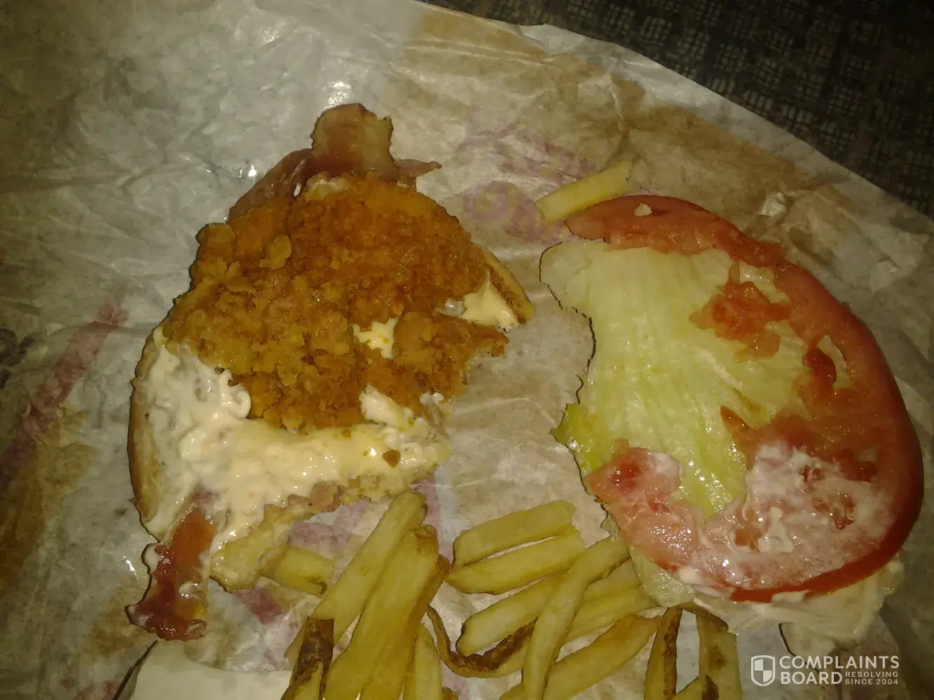 Read full complaint and 4 commentsburnt, dry, no sauce, fish bone