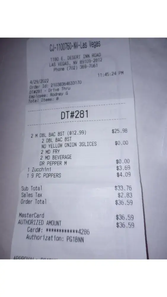 At 11:45 pm employee Rodney took my order upon getting home I discovered I was missing the other sandwich and the french fries were nasty. I attempted to call the store located at Desert Inn and Maryland Pkwy Las Vegas NV several times with no answer. The times are hard enough not to pay $36.59 for a meal and not receive it is not a way to conduct business.
