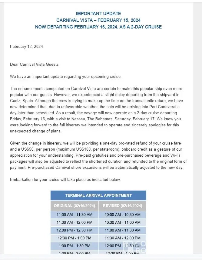Cruise changed from 3 day to 2 day cruise last minute
