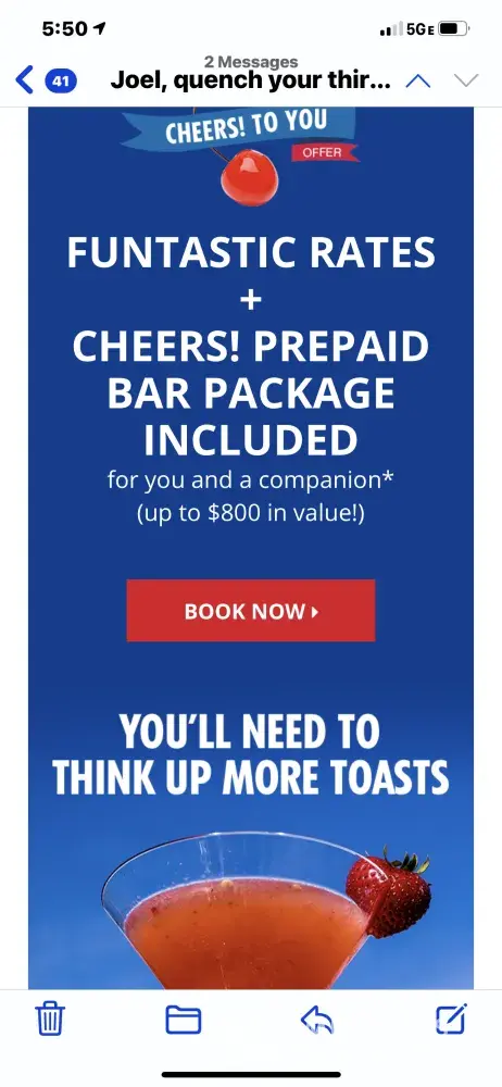 With this "automatically applied at checkout. " In mind, I proceeded to find a "funtastic rate" and I booked a cruise. Only to find out the free cheers package was not "automatically applied at checkout" . I tried to add the drink package ($900 after taxes and gratuity) and apply the promotion code from the email. It says "promotion invalid". I try again, same thing. I call customer service and they were closed. I call today and spoke with someone. This person says no you booked with a different code. No, I never entered a code. Why since it is automatically applied at checkout?! He asks me to send him the email. I do and when I do I clicked the link again to see if it worked still. It did. Then he tells me he cannot get it to reproduce. I tell him I can would he like a screenshot? I tell him maybe it's because it's linked to my VIFP number. No you booked under a different promo. How did I do that when I followed the link just like I was able to do again today? He tells me you can book your same cruise and same room for 3x what I booked it for and he will give me the cheers package or o can pay the $900 for the cheers package. What?! No! That was not what the email OR the website says! Why can you not honor what the promotion says on BOTH the email and your site? We cannot get it to reproduce that so I cannot give that to you at that rate. You're getting a good rate just pay for the drink package. Yes it is a good rate as an matter of fact it is a to use Carnival's term a "Funtastic rate" and that Funtastic rate should include the drink package as promised. What is so hard about that? Because you cannot reproduce it (and we know why because he is not logged in with my VIFP number) then it doesn't exist? I've given you proof! Hold on let me speak with a resolution agent. Comes back on the line, yea they said the same thing, you got a good rate just buy the drink package. I would if the promotion didn't say what it says! So you're telling me I'm just SOL (SH&! Outta Luck)? He replied "yes". You've got to be kidding me…