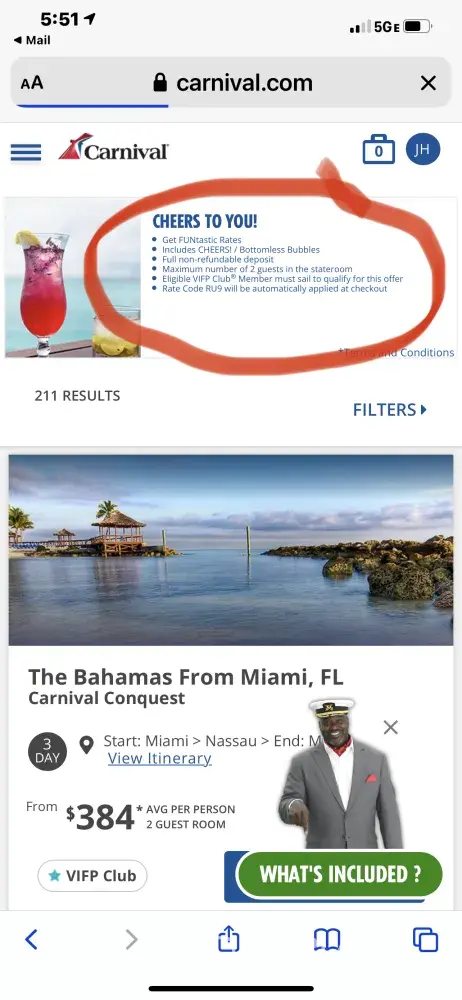 I received an email from Carnival that says "Funtastic rates + Cheers! Prepaid bar package included." With a link button to "book now" directly under it. Sounds like a great deal to me, ‘click' . It takes me to a page with my VIFP number already in and at the top of the page it says " CHEERS TO YOU!