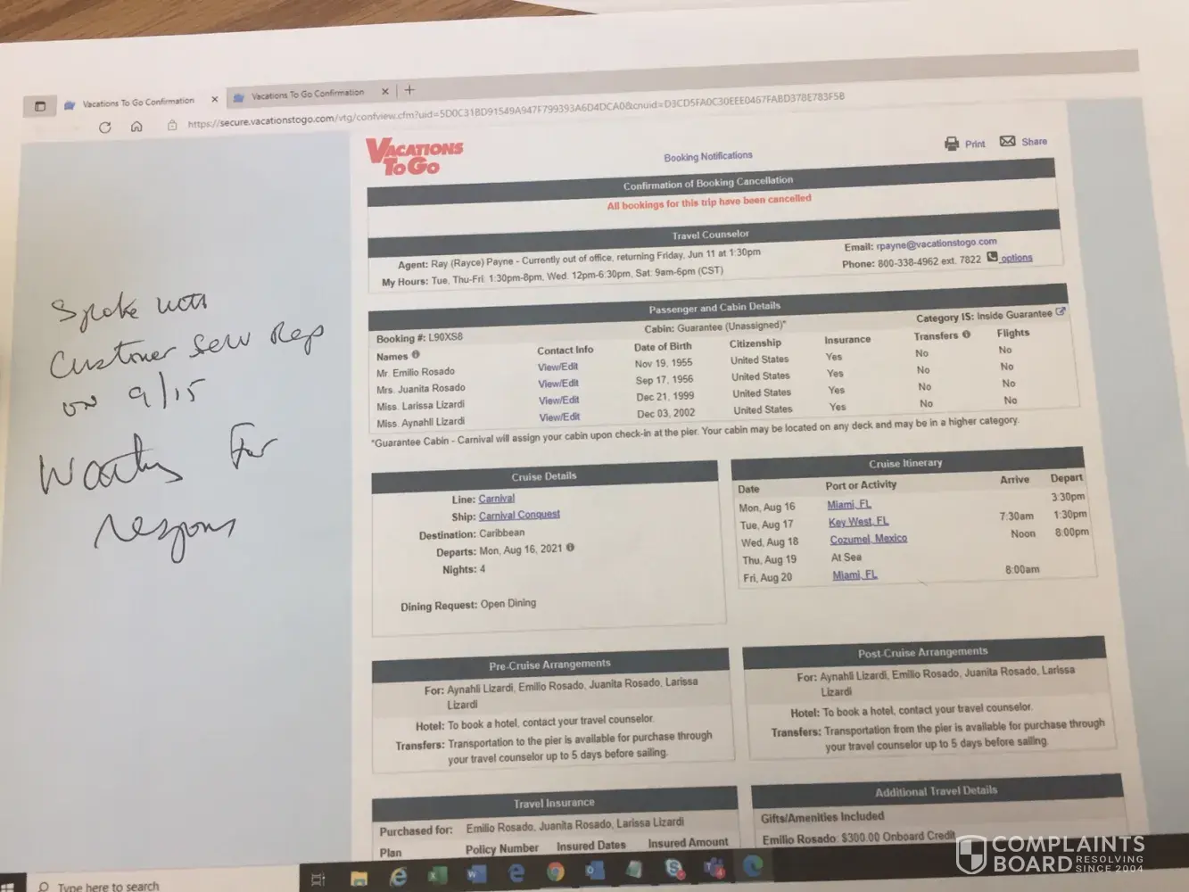 Desired outcome: Full monetary refund of the entire cruise including insurance