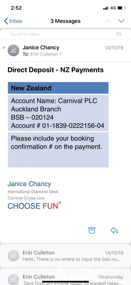 I initially paid an upfront payment of $5000 via debit card with a remaining balance of $2700. I then called to ask what other payment methods were offered and the carnival cruise phone consultant said I could pay via bank transfer. I advised her I was in New Zealand and could she send me the NZ bank details. She emailed me an NZ account (photo attached) which I made a $2150 payment to.