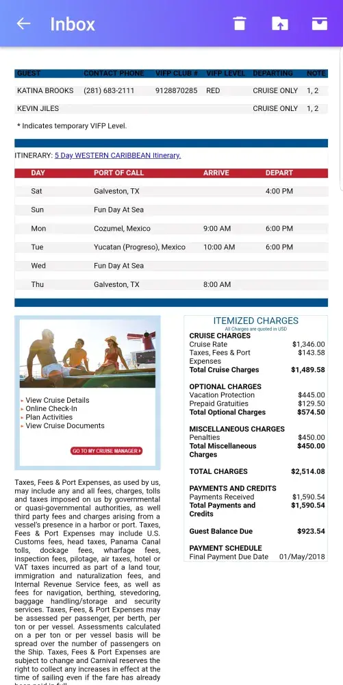 May we suggest you Do not submit or communicate via this open forum should you have any questions you can contact Carnival Service for assistance.