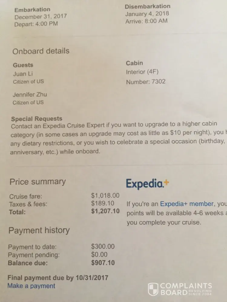 On Mar. 21 2017, I booked a Carnival Liberty 4-nights Bahamas cruise from port Canaveral from Dec. 31 2017 to Jan. 4th 2018 for my daughter and myself through Expedia. The $300 deposit was made on the same day. Originally, I had provided a Visa card, then I switched to MasterCard for the $300 deposit.