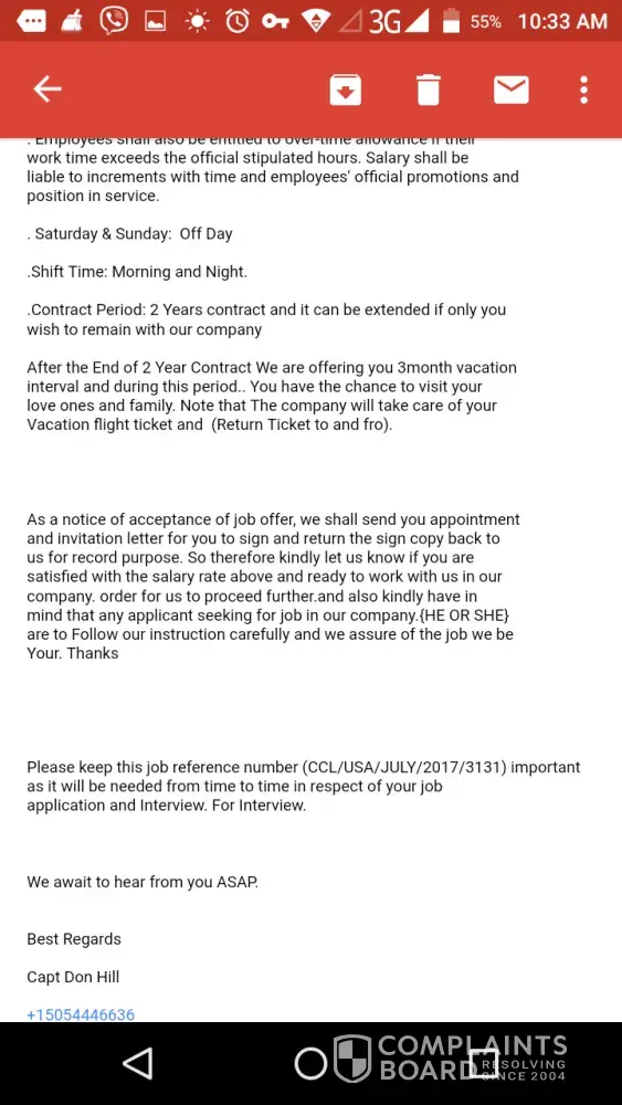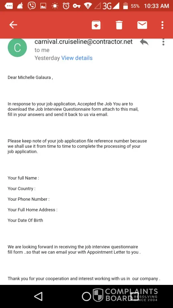 I just want to ask about the email that I recieved about last week ago.It was a job offer from carnival.[protected]@contrator .net.Can u just confirm it for me to clarrify if its real, or scam?