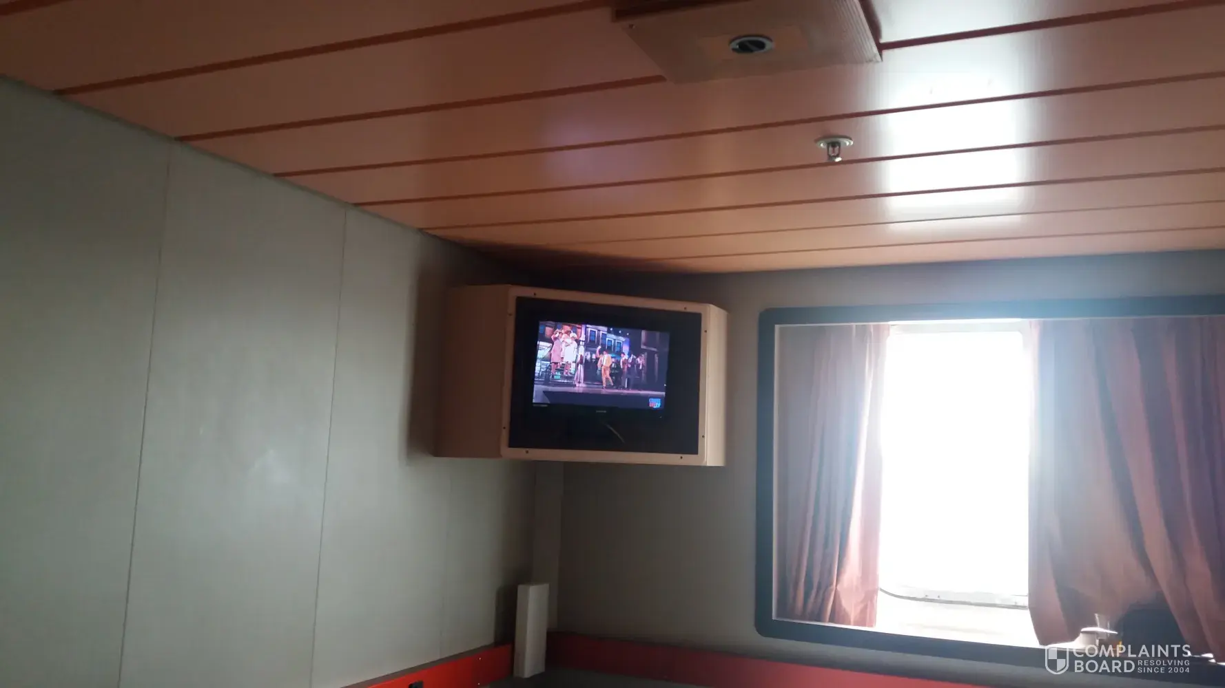 Upon arriving in our room, I nearly cried. I had taken a previous cruise through Carnival and the room was beautiful and well maintained. The room we were put in was disgusting. The carpet was has never been replaced (1998) and was filthy. We couldn't see out of the window because there was a leak in the seal between the panes except the one day the staff cleaned it. The furnishings were also from 1998 and were dirty and outdated. The mattress has never been replaced either which is probably some violation of health codes. Many public areas on the ship were outdated, rusty, damaged and badly in need of renovation and replacement. Some of the photos are posted below (cloudy window, flat-screen tv in old box, mildew on shower wall and more). The photos I saw on the websites (1st photo) were obviously taken when the ship was new, 19 years ago. To top it off, the room smelled so I had a headache most of the cruise.
