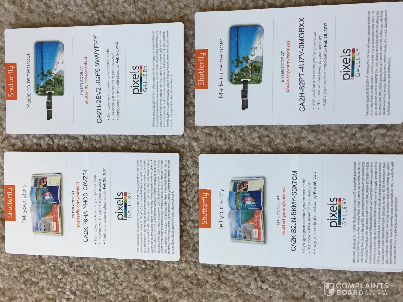 While on carnival cruise starting on 18 december 2016 (booking number 2tw4b4, ship carnival fascination, stateroom e-60, guest), I purchased 10 photos on the first formal dining and received one shutterfly free small luggage tag - code # ca2h-2ev2-jgf5-wwyfpy and free 8x8 photo book - code # ca2k-b2jn-bkmy-s8x7cm. I then purchased another 10 photos on the second formal dining and received another shutterfly free small luggage tag - code # ca2h-82pt-4uzv-0mgbxx and free 8x8 photo book - code ca2k-76ha-yhcd-c9vz54. after working on building the book (6 days), I tried to redeem my free gifts and couldn't. I spoke with shutterfly customer service who inform me that I couldn't both tag and book codes. only one per account and address, they also informed me that carnival was aware of the problem. they further stated that if the first four letters are the same, the system will automatically see it as the same code. on february 13, at approximately 10:45 am, I spoke with customer care, who also then spoke with the photos - pixels people, who stated that they were aware of the problem. but, couldn't offer me a new codes to make my purchase. as I explain to your rep this is false advertisement and I spend over $500.00 and was told by carnival photo rep that I could redeem my gift. that was a lie.