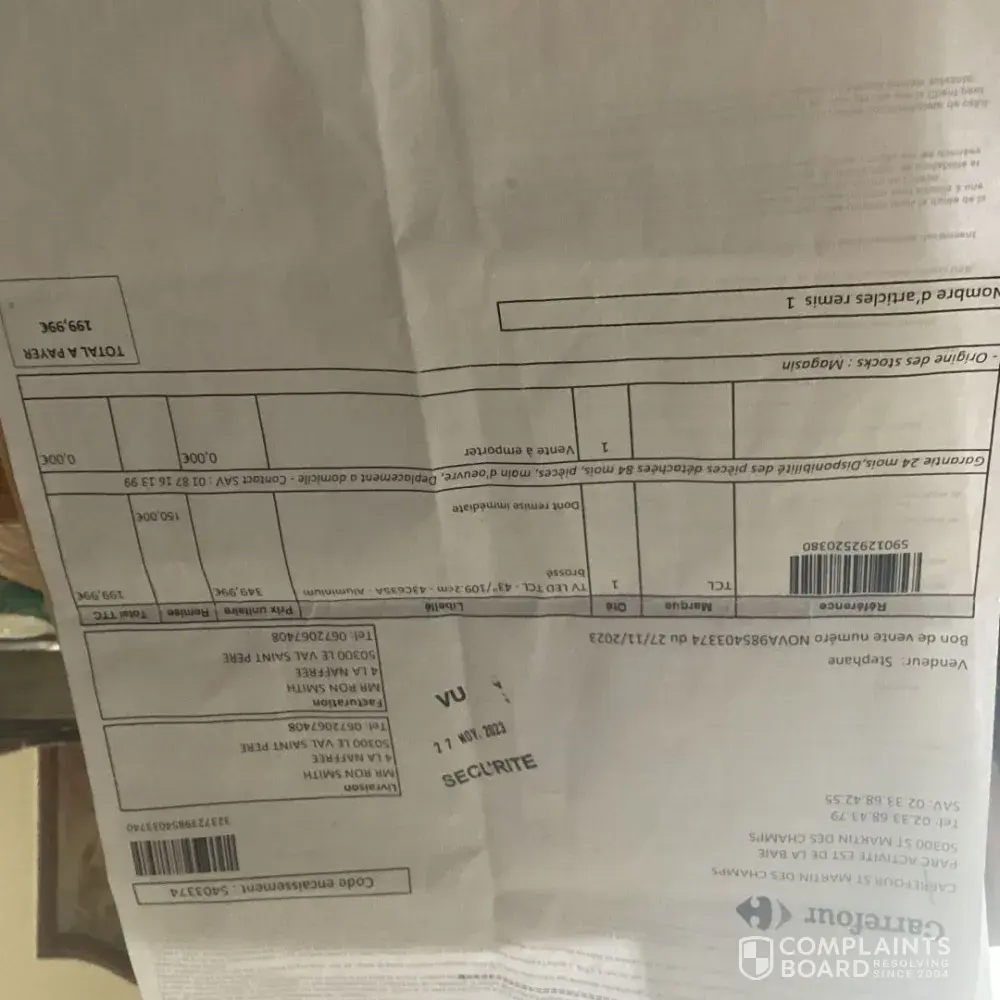 5. Nous sommes retournés à Carrefour le 12 février et avons de nouveau été informés par l'assistante de la réception que nous devions contacter directement TCL. Lorsque nous lui avons dit que notre contrat était avec Carrefour et non TCL, elle a convoqué un collègue pour nous parler. Cette personne a déclaré, en termes forts, que nous n'avions pas de contrat avec Carrefour et que la garantie commerciale de 2 ans était un contrat avec TCL et qu'il fallait les contacter directement.