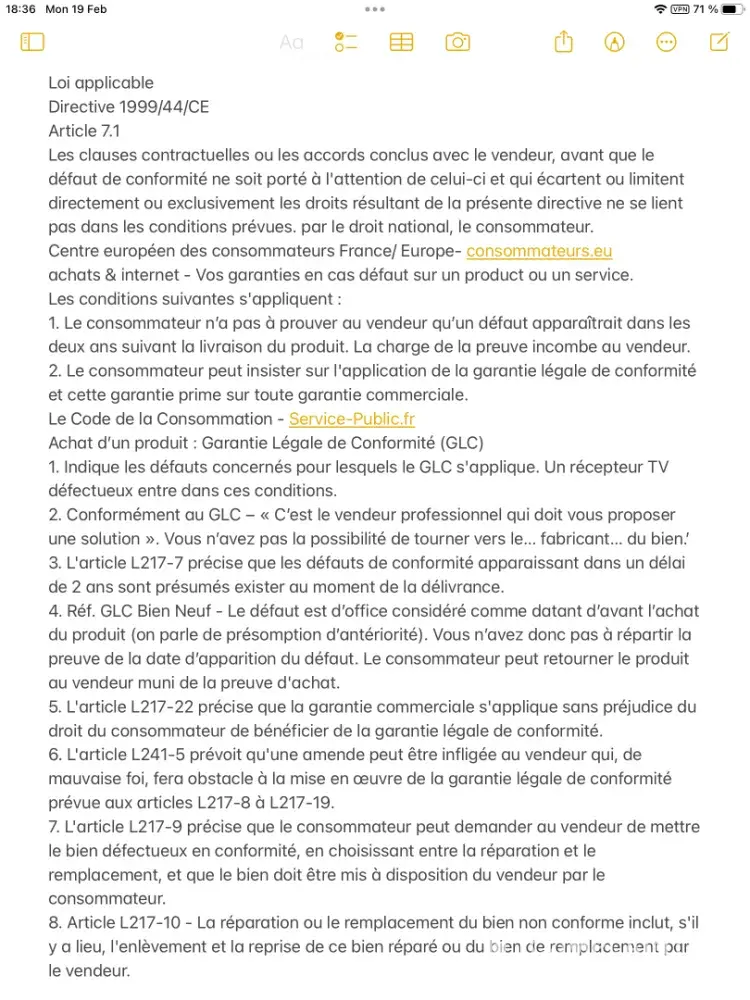 9. Le mercredi 14 février, nous avons demandé un rendez-vous avec le directeur de Carrefour afin de l'informer que nous souhaitions exercer notre droit légal de restituer le téléviseur défectueux au vendeur au motif qu'il n'était pas adapté à l'usage prévu par le Garantie de Conformité. Le Gérant a insisté sur le fait qu'aux termes de la Garantie Commerciale, nous devions contacter directement le fabricant en premier lieu afin de constituer un dossier, et a refusé d'écouter notre affirmation selon laquelle nous avions des droits en vertu du Code civil français et de la Garantie. de Conformité. (Réf. Service-Public.fr GLC Qui doit assurer le service après-vente une fois la garantie légale de conformité mise en oeuvre - le vendeur doit proposer une solution. Le consommateur n'a pas la possibilité de tourner vers le fabricant.)