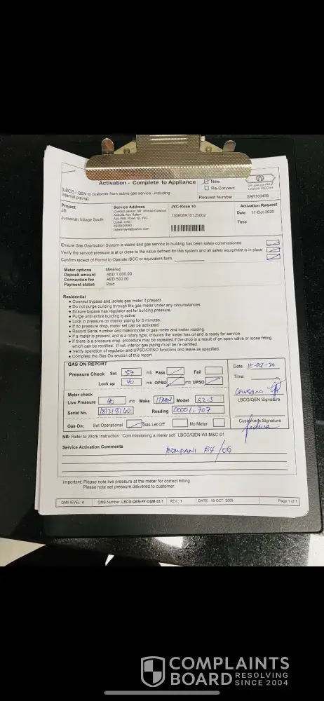 11 October > Lootah Gas came and installed the service and turned on the gas cooker and confirmed 1 eye is not igniting (form abailable)