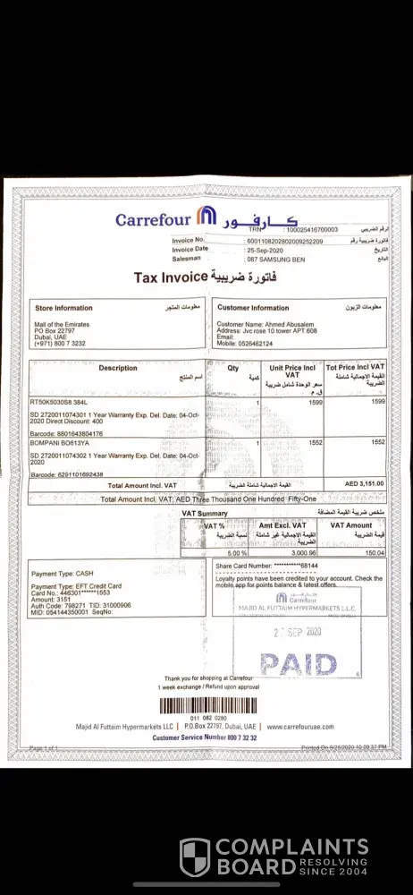I purchased two items from yas mall carrefour, the sales guy showed us different item and in the receipt mentioned different so I cancelled that one. For the second item I kept on calling customer service but no proper support was given as they keep on mentioning we don't have update from the supplier which is not my concern and the customer service is only for listening and not for giving solution to customer. Even after 1 week I didn't get my item as after one week they don't have any update from the supplier as they said.
