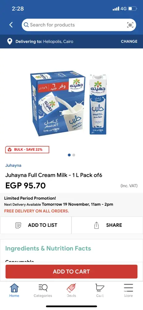 Juhayna Full Cream Milk - 1 L Pack of6 - I bought it last week with EGP 74.75 and today it has an offer 22% saving and is sold online by EGP 95.7. EGP 20 increase in one week considering that today's has offer of 22%! Same for NAN 2 OPTIPRO BABY MILK 6-12M 400G and Nestle Natural Water - 1.5 Liter - Pack of 12.