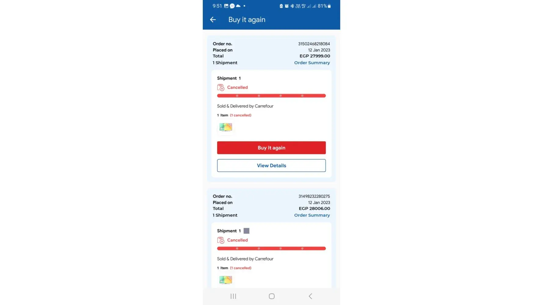 Carrefour Egypt I ordered a TV they first cancelled the order same day & asked to reorder & I did but they waited from 12 Jan till 16 Jan to cancel again on the delivery date & ask to reorder for the third time but they changed the price & when I called the holiness & asked why it was cancelled again they said because you ordered more than one time & reordered because the cancelled it