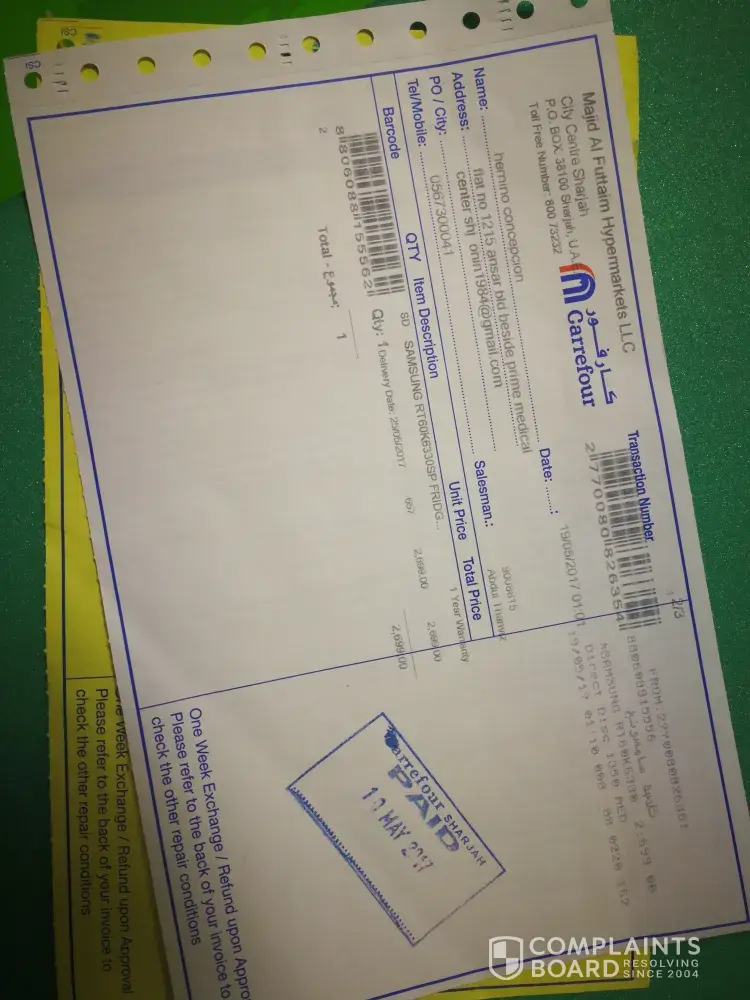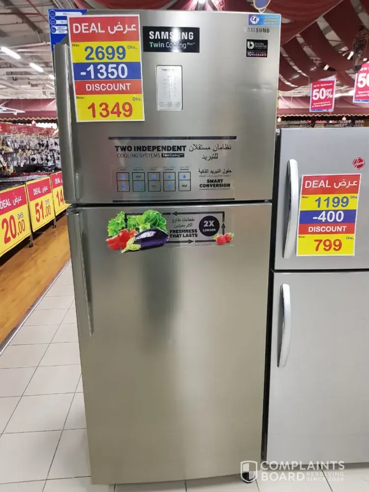 I purchased a samsung fridge on a 50% discount with the original price of 2, 699 aed on may 19, 2017 in sharjah city center.