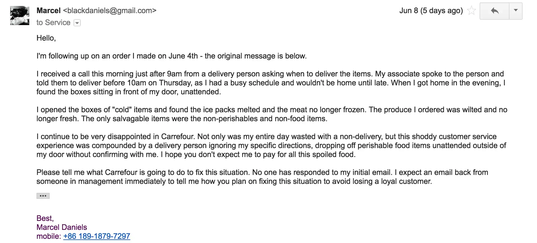 I've been dealing with a delivery ( Order # [protected] ) for over a week now and am tired of the poor customer service from Carrefour here in Shanghai. I have attached copies of the correspondence, none of which have been responded to. This is the third time delivery has been personally assurred would come by a certain time and I've wasted my valuable itme waiting for the arrival. I feel completely unvalued as a customer, and frankly, disrespected, as I warned the agent last time that I had no more faith in Carrefour's ability to make good on delivery promises and he personally guaranteed that the delivery would come on time.