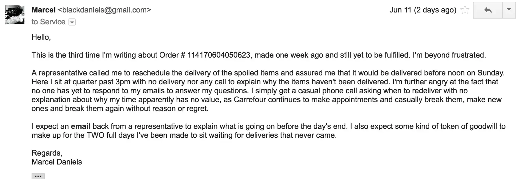 I ask of whoever reads this message to tell me A) how Carrefour will make up for all my lost time, hassle and inconvenience B) how you will make sure that this kind of service doesn't happen in the future, and C) how I will finally get my order, placed well over a week ago. I continue to patiently wait for a response.