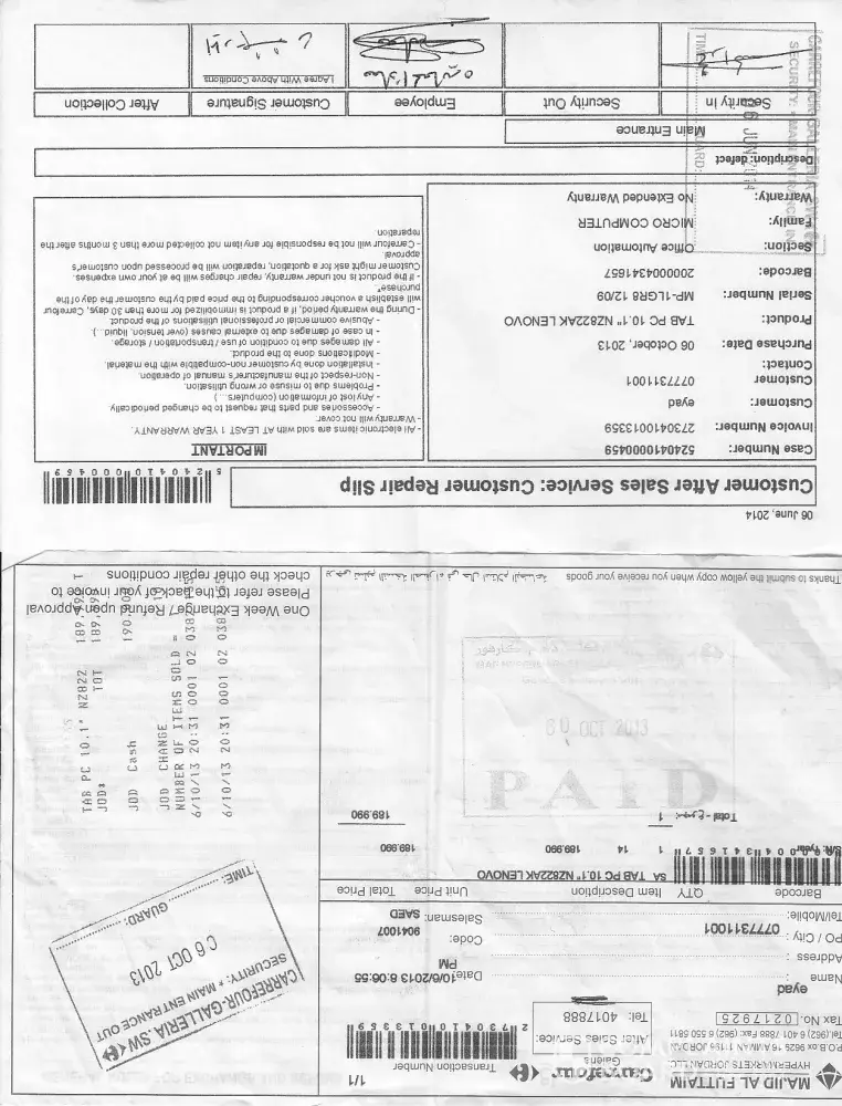 After i revived this email from Mr Vercauteren, I returned to Carrefour in Galleria Mall Amman Jordan, and asked for exchange because the Pad had been in repair for more than 45 days and as the General Rules For Exchange and Refund Say i am Entitled for an exchange or a voucher for the same amount of money that i bought the pad for, and when i arrived there i presented the voucher and the customer repair slip that was issued in 06 Jun 2014 and today is the 19th of July, to the it to a manager Mr. Mohammad alkhaledi and asked him for an exchange but he refused and stated that we (Carrefour) should not have taken the pad from me the first place because its not their Job and it my job to take it to repair under warranty ?!?! so i tried to explain that i bought it from you and common sense say that you are the one taking it for repair, after not reaching any conclusion i asked to see the manager, then Mr. Mohammad al masri showed up so i explained again that i neeed to exchange the pad because it has been so long since i gave it to carrefour, so he refused and explained that Mr. christophe should not have received it from you because it is out of warranty, so i interrupted him and explained that it is under warranty and i have the receipt, and then he replied even though we cant exchange it ?! so i said but your General Rules For Exchange and Refund states clearly that i can, and again he said it does not say that so i told him please read the general rules first and then tell me that, and i handed him the receipt and told him to flip it and read what was on the back, so after reading the text (which i dont think he read) he said no we cant exchange the goods or give you a voucher so i told him i have been in this mess for at least 8 months and i offered to share the emails i had with Mr. Christophe to have an idea, so he said i know everything i have your emails, so i said perfect so you know how much i have been suffering, he said that this is our policy and cant do anything about it, and asked me to pass by in few days maybe the Tab would be ready.