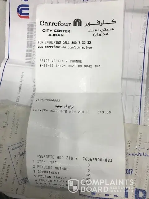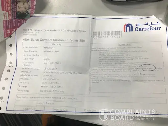 i am really unhappy and frustrated with Carrefour Ajman City Center, i bough the Se Gate Hard Disk 05/07/2017 and its go faulty (not detectable) with in 1 and half month, i went to customer service and submitted the item on 28/09/2017, after too many visits finally today they refuse to give me repaired item or replacement, when i bought the item they told me 1 year warranty make their customer fool.