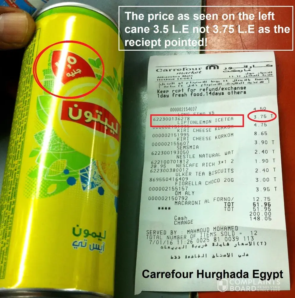 I've been waddled gleefully into your Carrefour branch Hurghada, Egypt earlier today. to get some quick shopping as usually every day before I started my work, I selected many items ..in between was "Ice Tea Lemon cane were priced in L.E 3.5 as wrote on the top of the cane “please look on attachment” Were on receipt you’ll find it’s pointed in L.E 3.75.The fact it was not the first time, I was embraced on such a reputed mistakes which I had noticed the supervisor as twice before. I told the cashier to return the receipt correctly & to delete it. He said I'd have to take the L.E 3.75, I told the cashier again to call a supervisor! Supervisor came & do nothing effectively same like before!