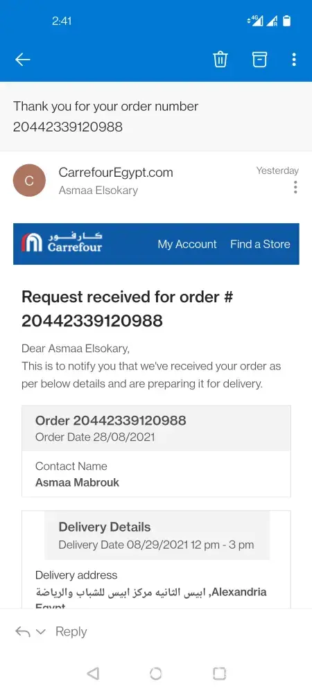 I complain about the order details in below from online Carrefour Egypt because I haven't received the product yet.