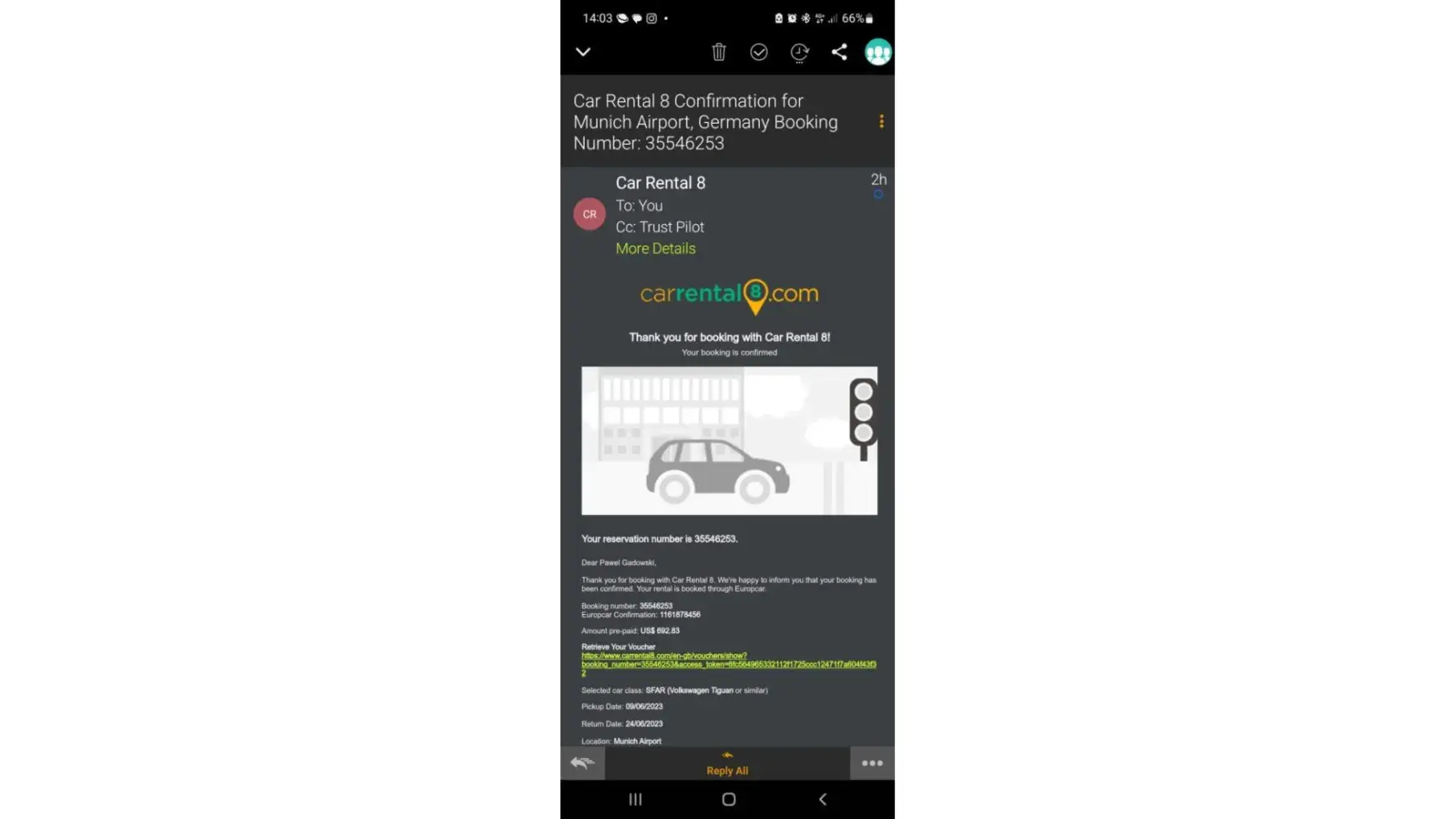 After getting a confirmation # we went to pick up the car in Munich only to find out that CarRental.com have canceled the rental for "suspected fraud" reason. This is nonsense. My credit card payment was verified on-line at the time of purchase. Instead of getting a car for a confirmed reservation for 2 weeks for unlimited mileage for ± $700, we had to pay over $5,000 for that same deal as there was no other options and we would have loose all hotel bookings in Europe if we did not start traveling that night.