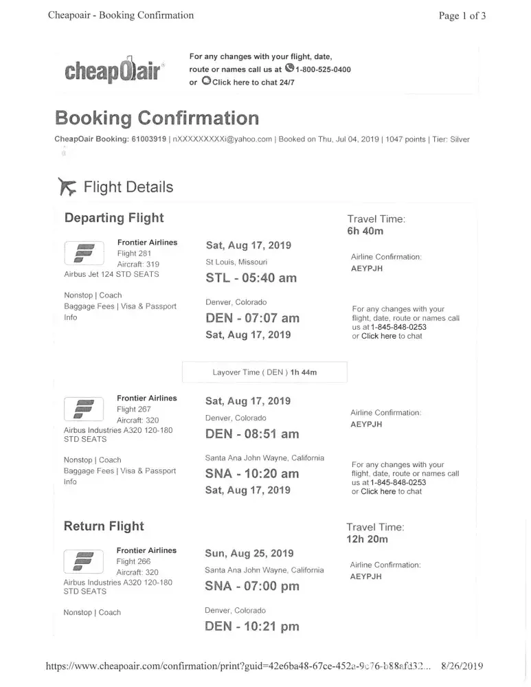 I flew with Frontier Airline (my first mistake) from St. Louis, MO. to Santa Anna, CA. on 8/17/19. My early flight was canceled & it was pushed 3 hours, meaning I missed my connecting flight to my destination and I could not get my already pre-paid rental car to be picked up at 4:30 Pm same day. I was transferred to LAX that's 50 miles north of my original...