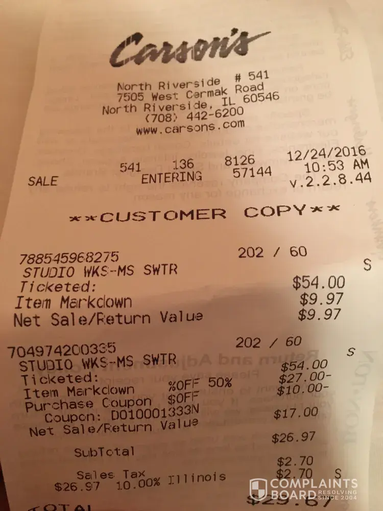Fine I say go home call customer service for Carson's ...Well that was a bigger nightmare. All this women would say is "this is our policy...no receipt no return. So I finally said can I have the email address to the owner or president to get this resolved...answer can't give out that information.