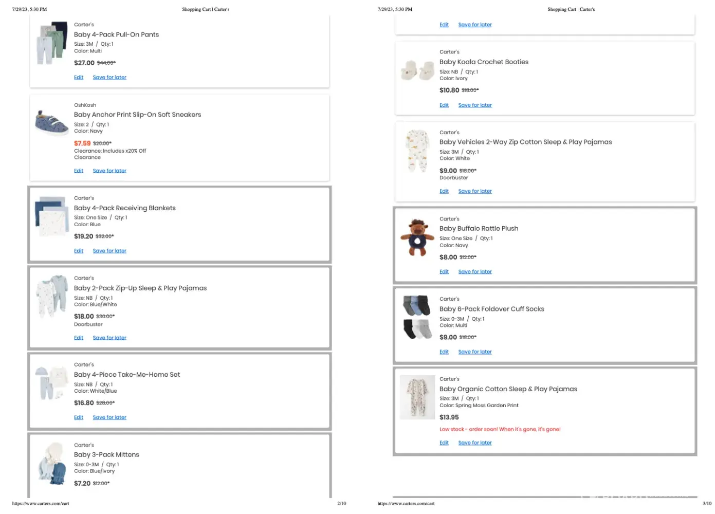 I believe Carters' conduct is deceptive and unfair to consumers. By charging an inflated amount on the checkout page, they are taking advantage of unsuspecting customers, including myself, and essentially overcharging for their products, in violation of consumer protection laws.