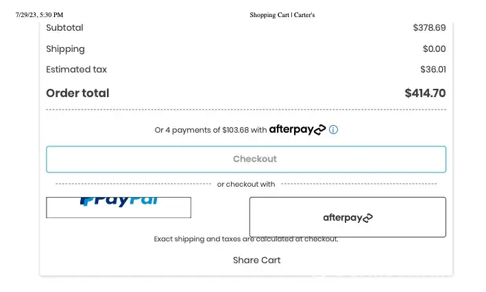 The issue at hand is Carters charging an incorrect amount during the checkout process for my order. The checkout page displayed a total amount of $414.70, significantly higher than the actual order total of $278.04. This discrepancy amounts to an overcharge of $136.66, representing a 49.16% increase over the true amount.