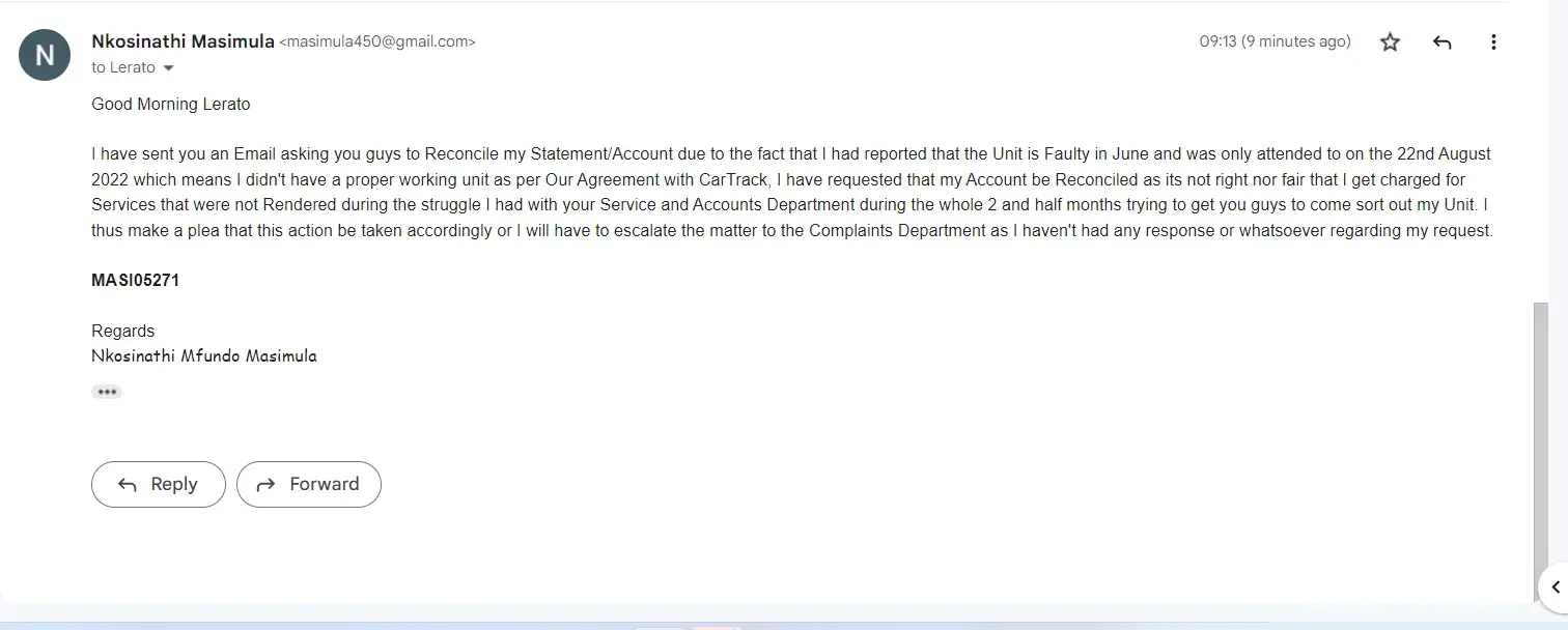 I am deeply disappointed with Cartrack service since I joined them. I have been with them for the past 23 months and only stayed because of the contract. Cartrack will never communicate. If you go to an area that you have never been to before they don't send a notification to show you that the car is always under surveillance or around the clock monitoring is active.They will never call to ask if you are safe. Cartrack never send notifications of high risk areas. They have just been collecting money from me. Last night I had to use the manual key because the battery for the key was flat. The alarm went off and screamed until it had tears but they never even noticed. So what kind of a vehicle tracking company is this, that makes you aware that they don't exist? I hope they don't renew the contract automatically without my concern. I am going back to the competition who were streets ahead in terms of service delivery. Disgruntled but going. Pakiso Mphuthi