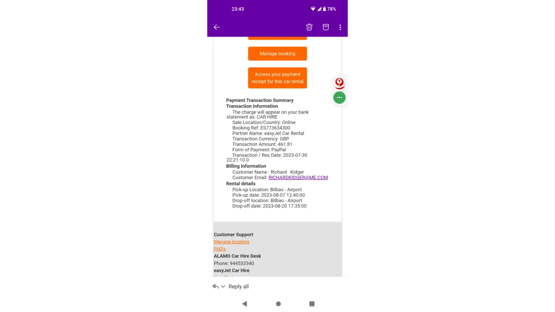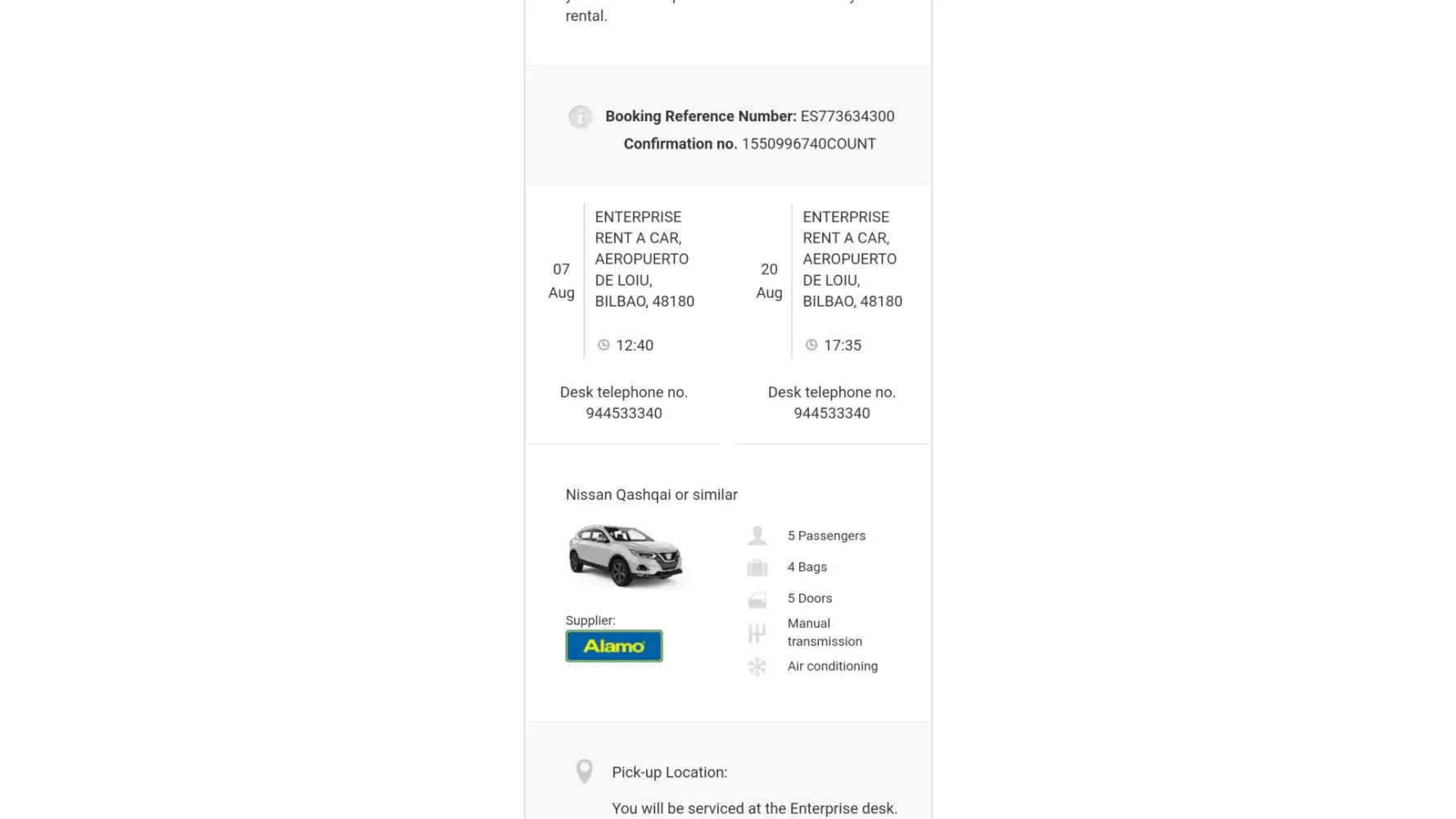 We hired the car through easyJet, only to find out that the rental was managed by ETrawler UK Limited in Barcelona. During our attempt to resolve the issue, the company's customer service was extremely rude, and they cited their policy that denies a car or a refund if the customer is late for car collection. As a result, we were left without the reserved vehicle and without a refund. Consequently, we were forced to pay an additional €500 to Alamo Car Hire for a significantly smaller and less powerful car, which could not accommodate our luggage adequately.