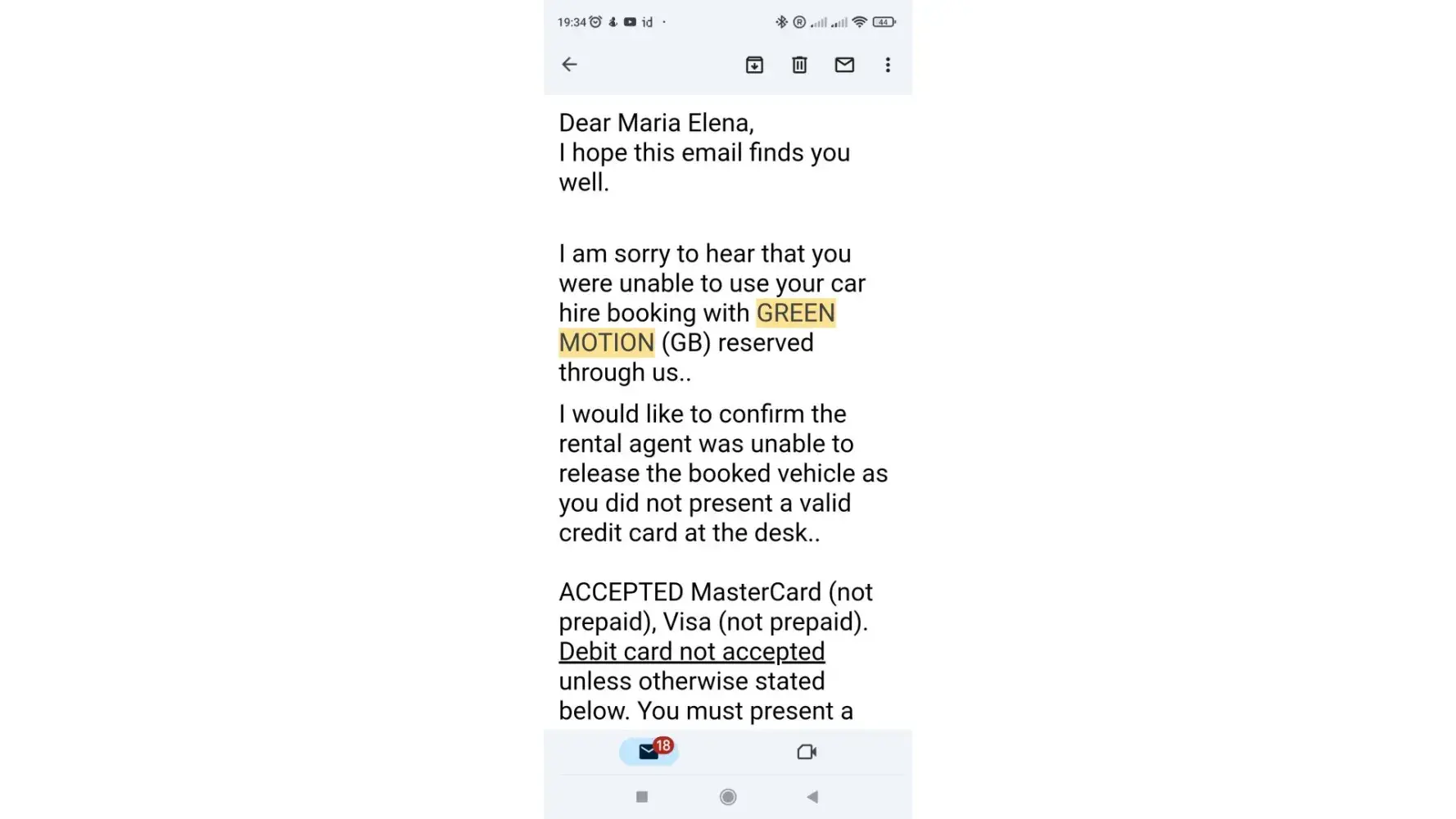 The 04/11/2023 I hired a car for two weeks.I paid through PayPal. When I get to the Company Green motion at the airport, I had to leave some money stuck as a fee to get the car. The Company did not accept a debit card just a credit card. As I did not have a credit card I could not hire the car. I wanted to cancel the rental but the Company did not cancel it and charged me the whole amount of the two weeks of booked. They could have charged me just a small penaly.