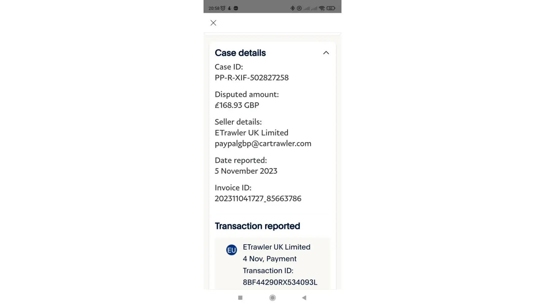 Claimed loss: I want a refund of the total amount of 168.96 pounds