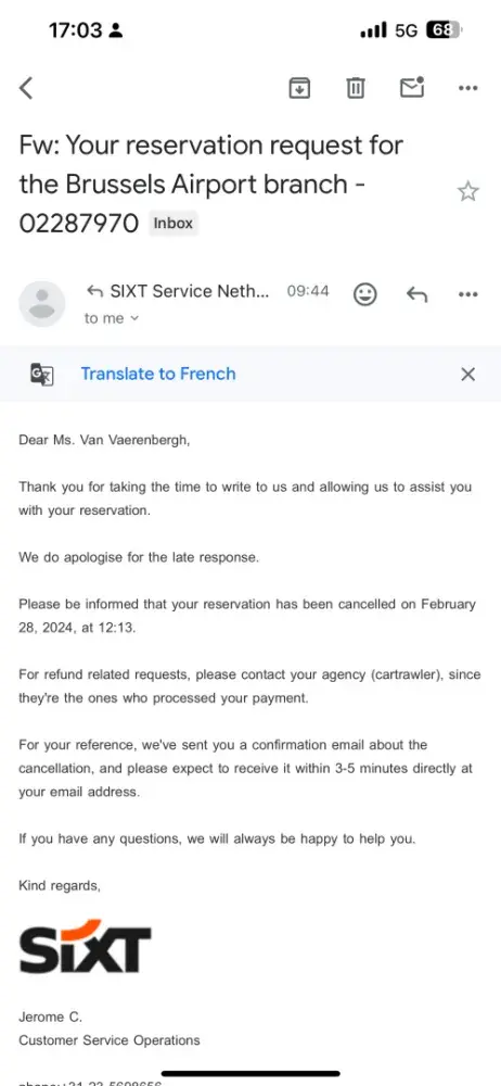 Hi how are you I reservation the for 6 day and me when I am arriving late they said the car it’s cancel I told them they should any body call or send email for because me I am not told them to cancel the reservation and after I call the company they said the money not refunded i told the now only you take money and doesn’t not do any thing ,, I swear that not good and I want my money returned