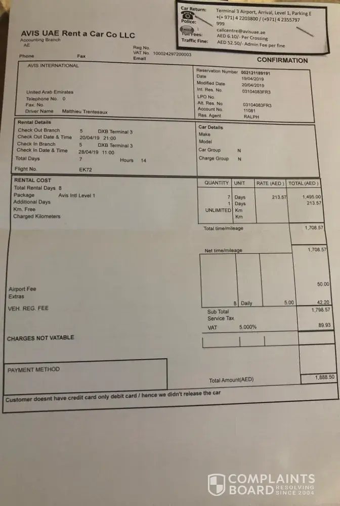 when I returned the car on the 13 April, 2019, my credit card was charged by the full amount of the USD 743.45.