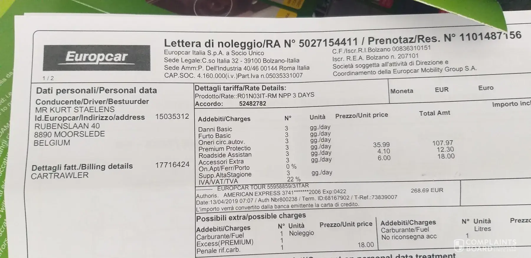 Af tehalen bij Keddy in luchthaven Malpensa Italy op 13 april en die is betaald met Amex. 123.57 euro en 51.21 euro op naam staelens kurt ...