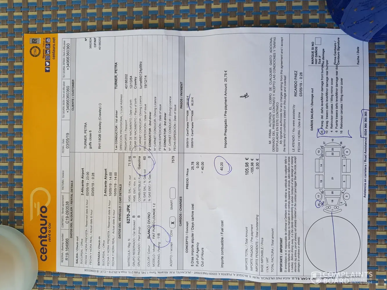 I would like the original contractual agreement to be honoured, and to return the 80.20 Euro that I was surcharged when collecting the car. I would also like a full apology for the way I was handled by the car collection agent. I make many trips to Alicante each year and I do not wish to have to go through this same experience again.