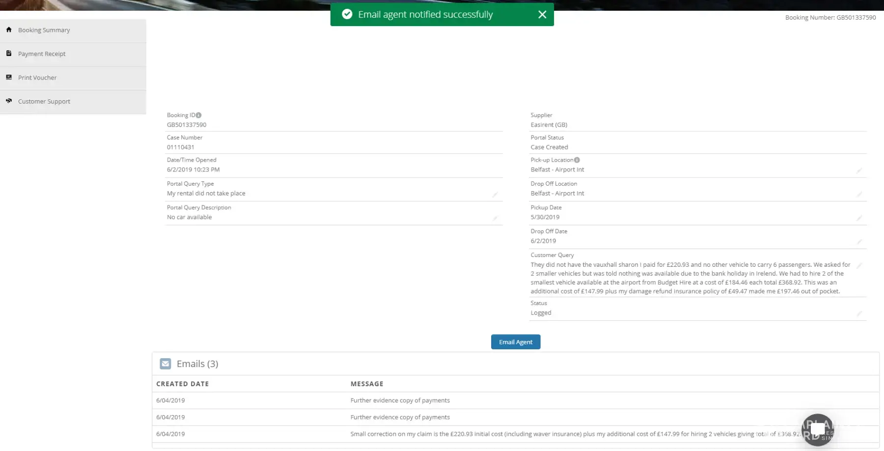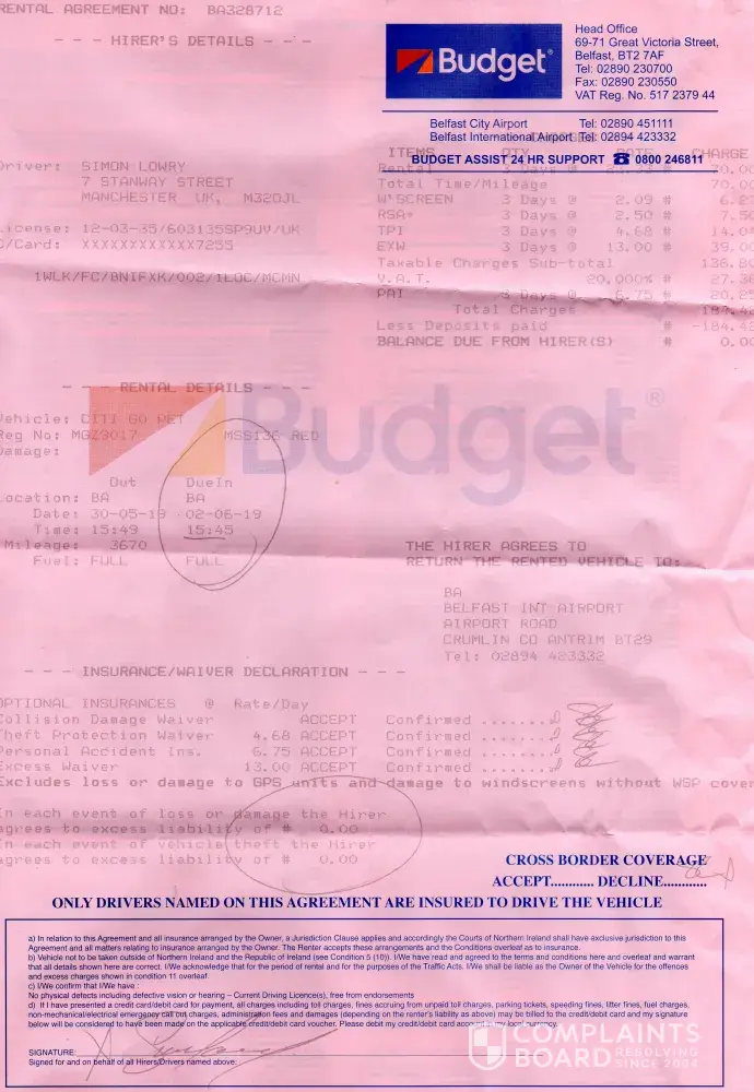 The issue that I have experienced was: I hired a people carrier through Ryanair Booking number GB501337590 from Belfast International Airport on 30th May 2019 with Easirent
