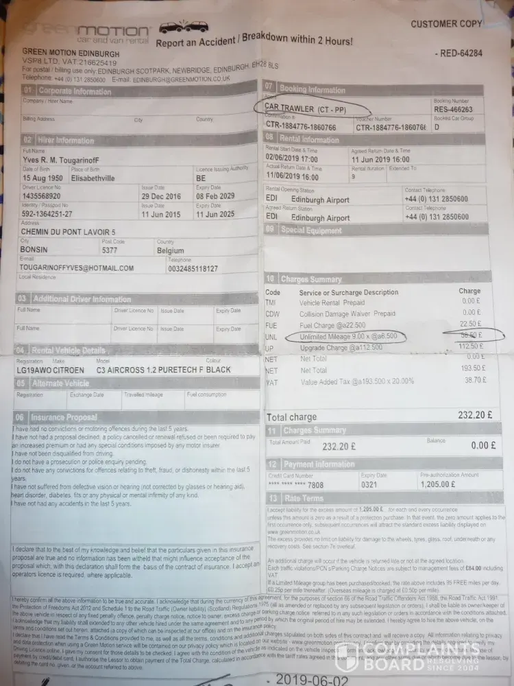 I have booked a car trough Brussels Airlines ref : GB508981510 on 4 february 2019 for my travel in Scotland with unlimited km. At the airport of Edinburg, the company Blue Motion ask me to pay 58, 50 pounds for unlimited mileage. This company was not aware. So I want to be refund on my banking number be [protected]. Hereby a copy of the document.