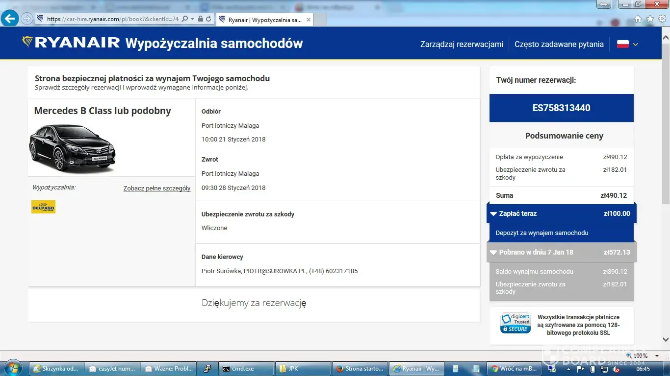 I made a reservation of car in Malaga, Spain via Ryanair Car-hire. During reservation I was clearly told that all I have to pay is 100PLN now and the rest (for car hire and whole insurance fee) until Jan 7th, 2018.