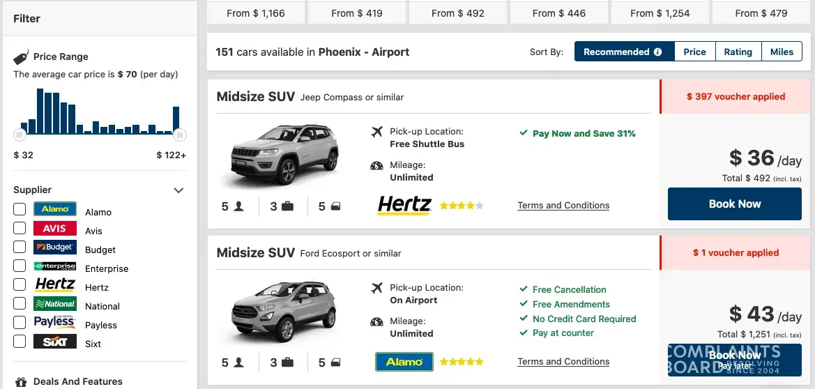 Please find attached screenshots of what I was working with in today's booking attempt. Again, Hertz shows the full voucher amount being applied and the other's only $1. When I proceeded to purchase what showed to be a booking for $491.94; once I hit confirm the amount changed to $888.94. I have contacted my credit card company and canceled the $888.94 charge. I have also called Alaska Air and shared my very disappointing experience. I have lost track of how many days and hours I have lost trying to book with this company, it has been extremely frustrating.