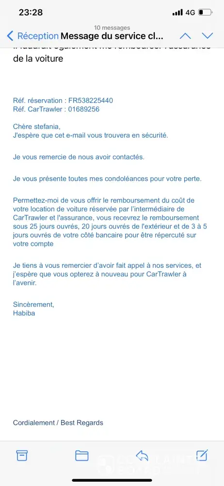 Having used the car 3 days instead of 7 days, I am requesting CAR HIRE / CARTRAWLER a refund for the unused 4 days. The amount should be 70.7 Euros (17.67 x 4 days). I was in touch with the agent Sile of TrawlerCustomer service who confirmed on December 14th that I should received the refund and that would take at least 25 working days to process. Since the email, I have not received any form of correspondance not a refund despite several reminders (3rd & 11 Feb, 1 March). We are now 14 April, 4 months after. I look forward to a positive outcome of my request. Yours sincerely,