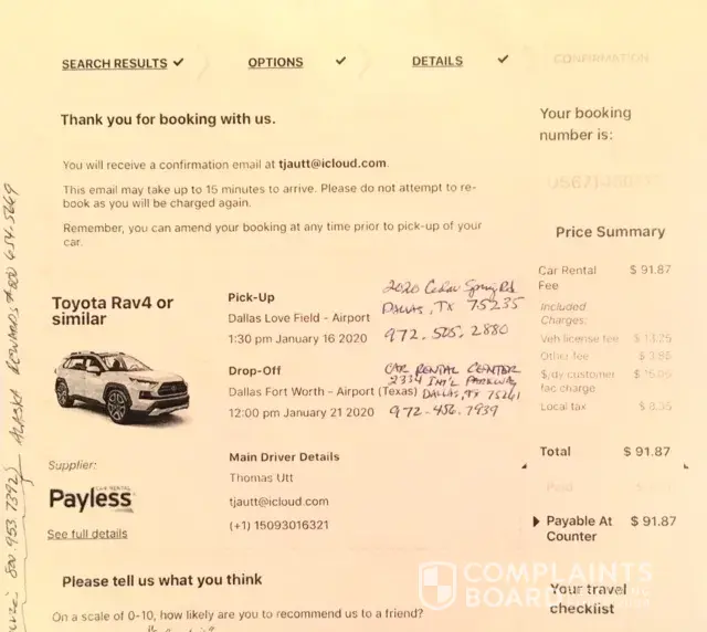 On 15 Jan 2020, submitted booking for Toyota RAV4 at DAL, to pick-up on 16 Jan 2020 for $91.47. Immediately received an email confirming that my booking was received, #US671450710. Did not receive any further emails. I called and was told no reservation was made, and the vehicle was now offered at $208. I rented a smaller vehicle (#US671669750). Apparently, a classic "bait and switch." Why wasn't I notified if booking wasn't confirmed so that I could immediately resubmit my request? Instead I had to paymore twice as much for rental as what was offered and accepted. Also, when this form is set for "ENGLISH" and I attempt to select from the list in Enquiry type: the list shows in Hebrew. Could not get display to reset to ENGLISH. Finally used "ENGLISH (Ireland)." Finally, today I tried to call CarTrawler (at 2:30 pm, PST/5:30 pm, EST) and received a message that the lines were closed, but the message stated hours as 8 am - 6 pm. No time zone specified. If the hours are for anywhere in the Continental United States, the office should be open. If the hours are for another time zone (Ireland?), it should be stated on the recorded message. Thanks for your consideration.