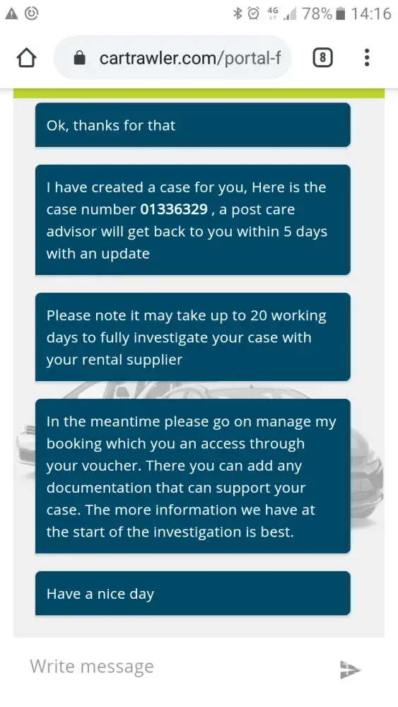 Please note it may take up to 20 working days to fully investigate your case with your rental supplier