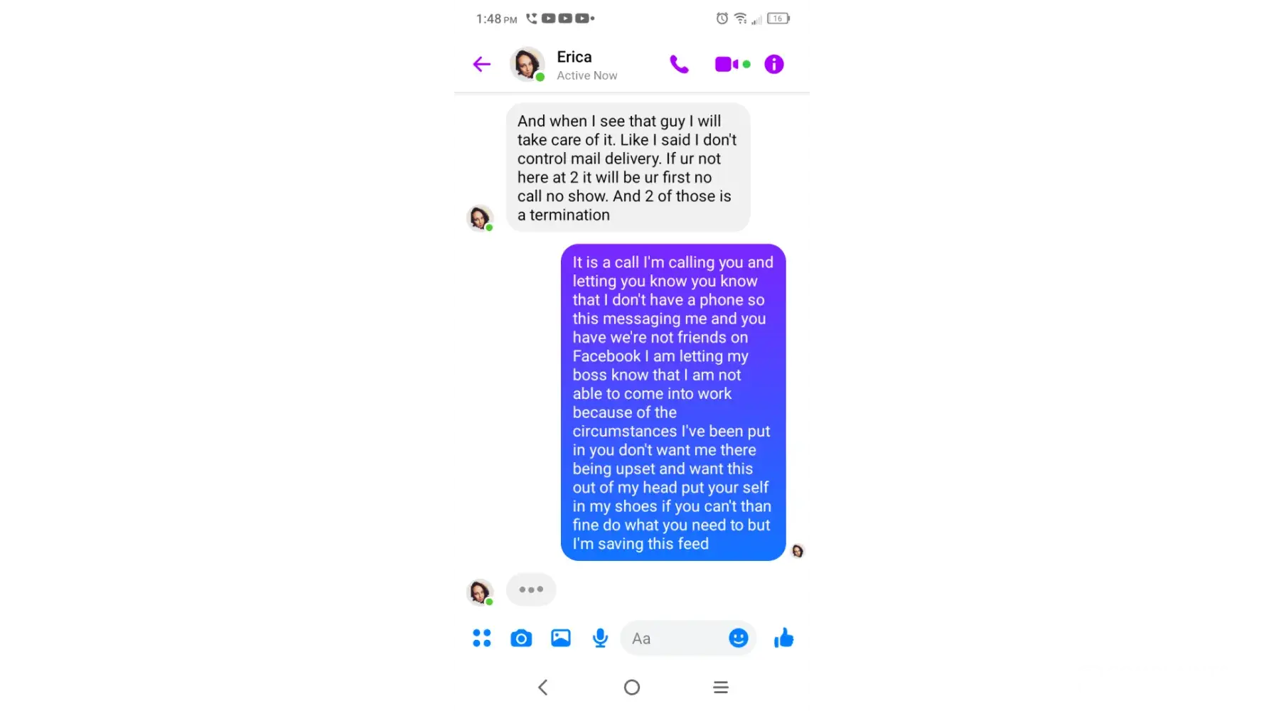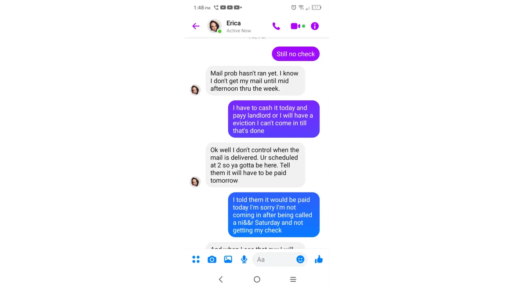 So problems didn't start till my third week. She had hired me and discussed pushing a younger guy out because he was disruptive. More recent my check was late because it was a paper check my bank was having issues and I couldn't use them for direct deposit. She knew the mail would be late so I had asked if she would call corporate to make sure it's on it...