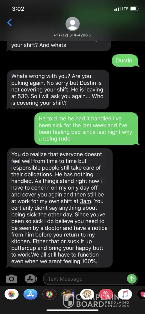 My kitchen manager has repeatedly harassed me over text the first I told my boss she said she would handle it nothing got done at all and now it jsut happens again today cause I was sick I've tried to talk her a little this multiple times she always come back with I'll make sure you don't get any hours in my kitchen or telling me to suck it up and get over it